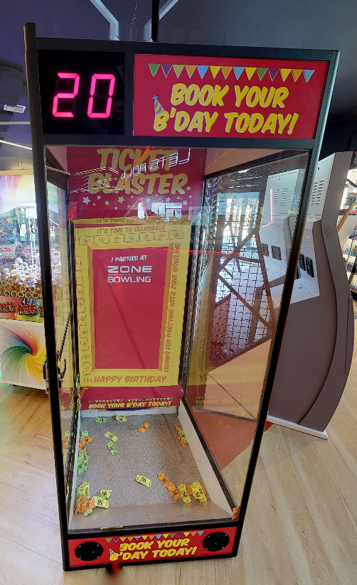 The Ticket Blaster is a glass booth where the birthday child is placed. It is filled with Powertickets that can be used to redeem prizes at our prize shop. Once the door is closed, air blows from the bottom, scattering the tickets all around the booth. The child then tries to catch as many tickets as possible before the timer at the top runs out. These tickets will be added to the birthday child's already included amount of tickets that they can redeem.
